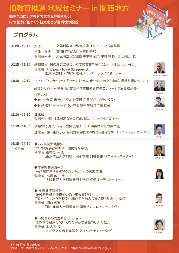 文部科学省IB教育コンソーシアムでは、国際バカロレア(IB)教育に関心をお持ちの教育関係者、生徒・保護者、ならびに自治体・大学関係者の皆様を対象に、地域セミナーを開催いたします。