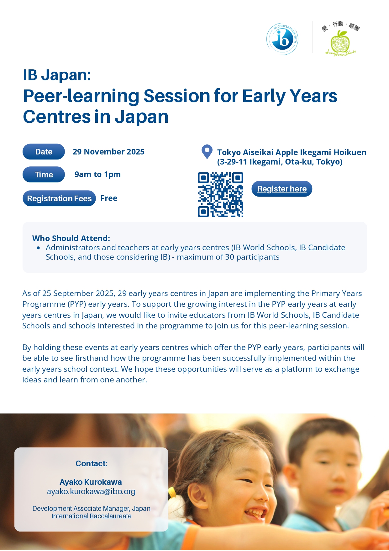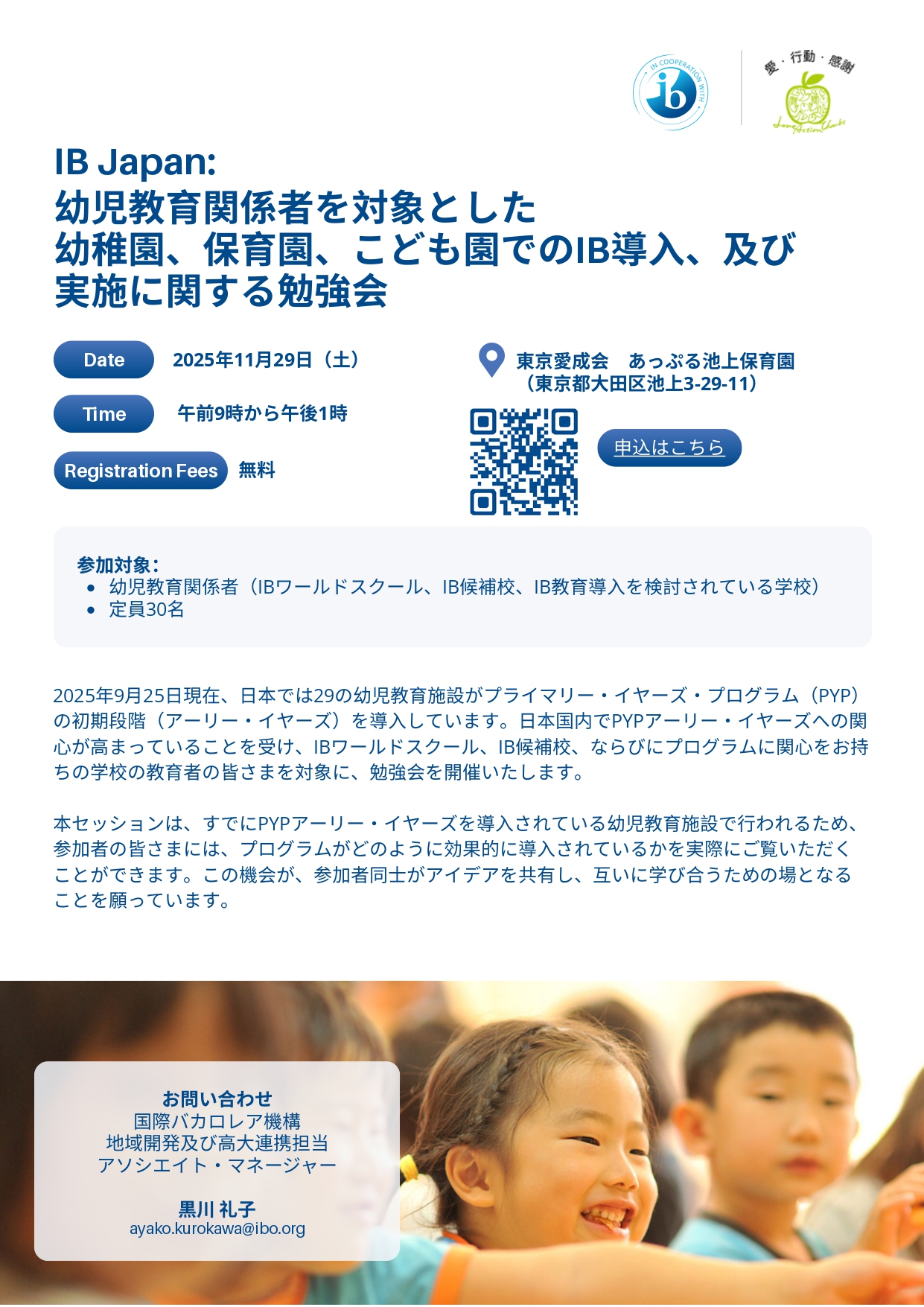 2025年9月25日現在、 日本では29の幼児教育施設がプライマリー・イヤーズ・ プログラム(PYP)の初期段階(アーリー・イヤーズ) を導入しています。日本国内でPYPアーリー・ イヤーズへの関心が高まっていることを受け、 IBワールドスクール、IB候補校、 ならびにプログラムに関心をお持ちの学校の教育者の皆さまを対象 に、勉強会を開催いたします。