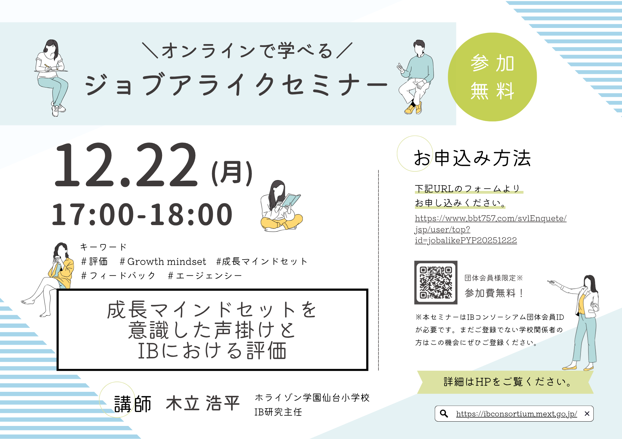 文部科学省IB教育推進コンソーシアムでは、国際バカロレア(IB)教育に携わる教員の学び合いや実践交流を目的として、2025年度「第3回ジョブアライクセッション」を下記のとおり開催いたします。
