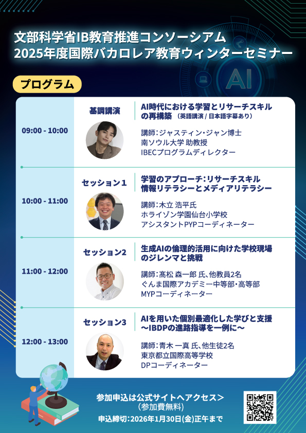 文部科学省IB教育推進コンソーシアムでは、国際バカロレア(IB)教育に関心をお持ちの教育関係者、生徒・保護者、自治体・大学関係者の皆様を対象に、「ウィンターセミナー」をオンラインにて開催いたします。 本年度は通年テーマとして「国際バカロレア教育で生きる力を育もう!」を掲げており、今回のセミナーでは 「AIと情報・メディアリテラシーを活用した個別最適な学び」 を主題とします。