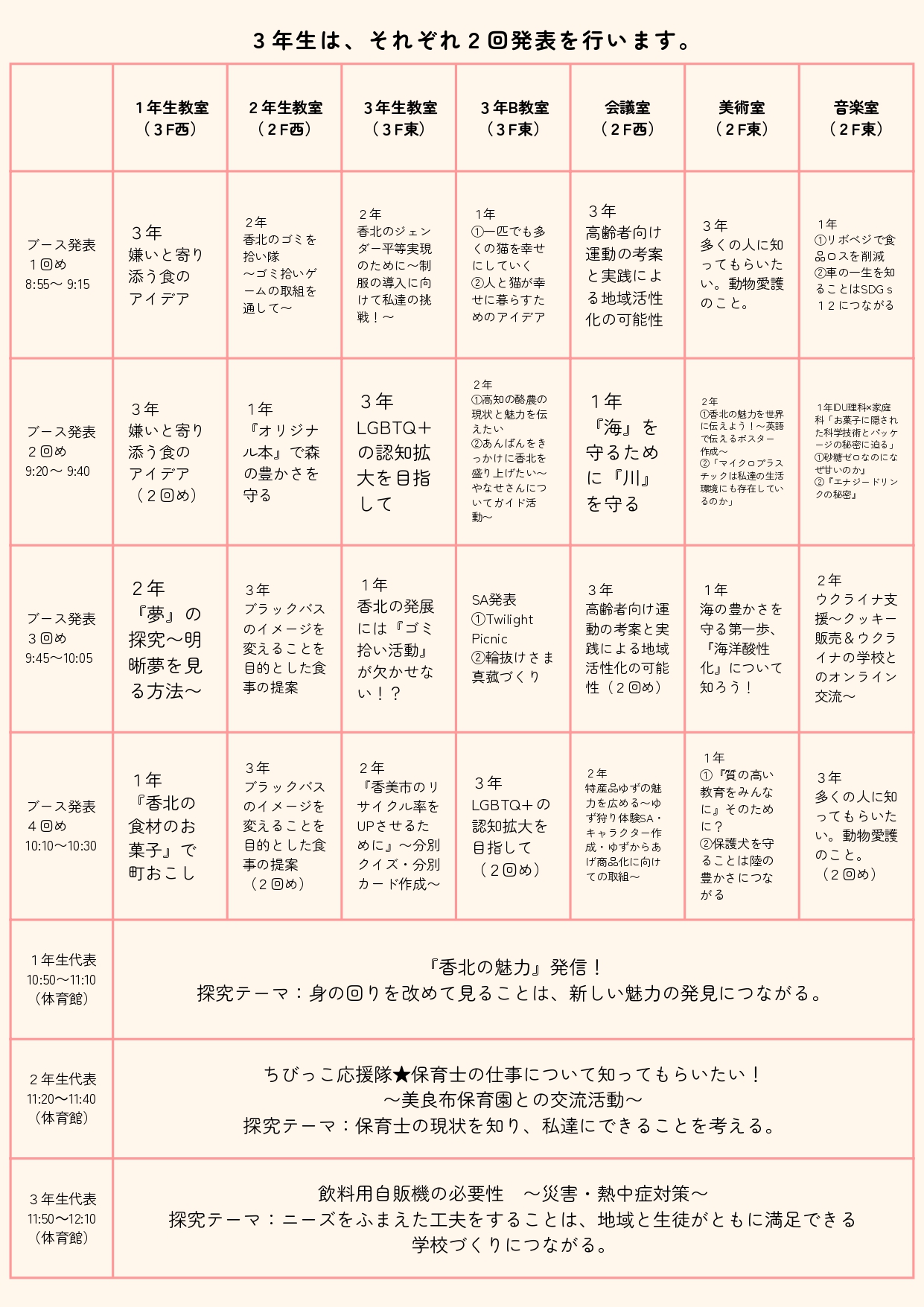 今年度は、すべてのグループ(または個人)が発表を行います。前半は、7つのブースに分かれて発表し、3年生はそれぞれ2回発表します。後半は体育館に移動し、各学年の代表グループ(または個人)がステージ発表を行います。1~3年間の学びの成果を、ぜひご覧ください。