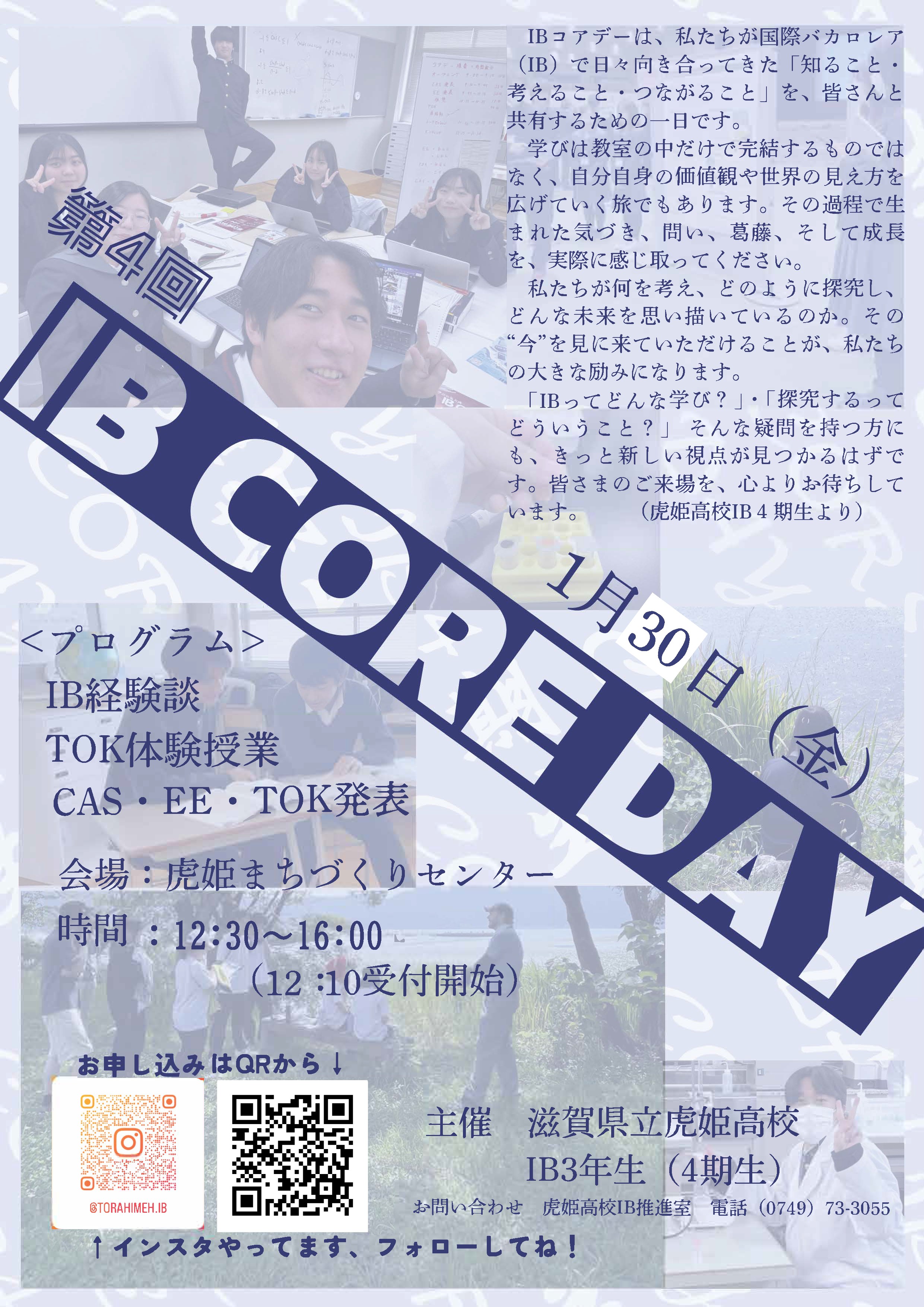 本校では、下記のとおり、国際バカロレア(IB)の学習成果発表会「IBコア・デー」を開催します。“コア”とは、国際バカロレア・ディプロマプログラム(DP)の根幹となる3つの必修科目(EE「課題論文」・TOK「知の理論」・CAS「創造・活動・奉仕)で、当発表会では、四期生(3年生)によるコア科目の成果発表のほか、参加者の皆様に国際バカロレアの学びを体験していただく生徒企画のワークショップなどを予定しております。