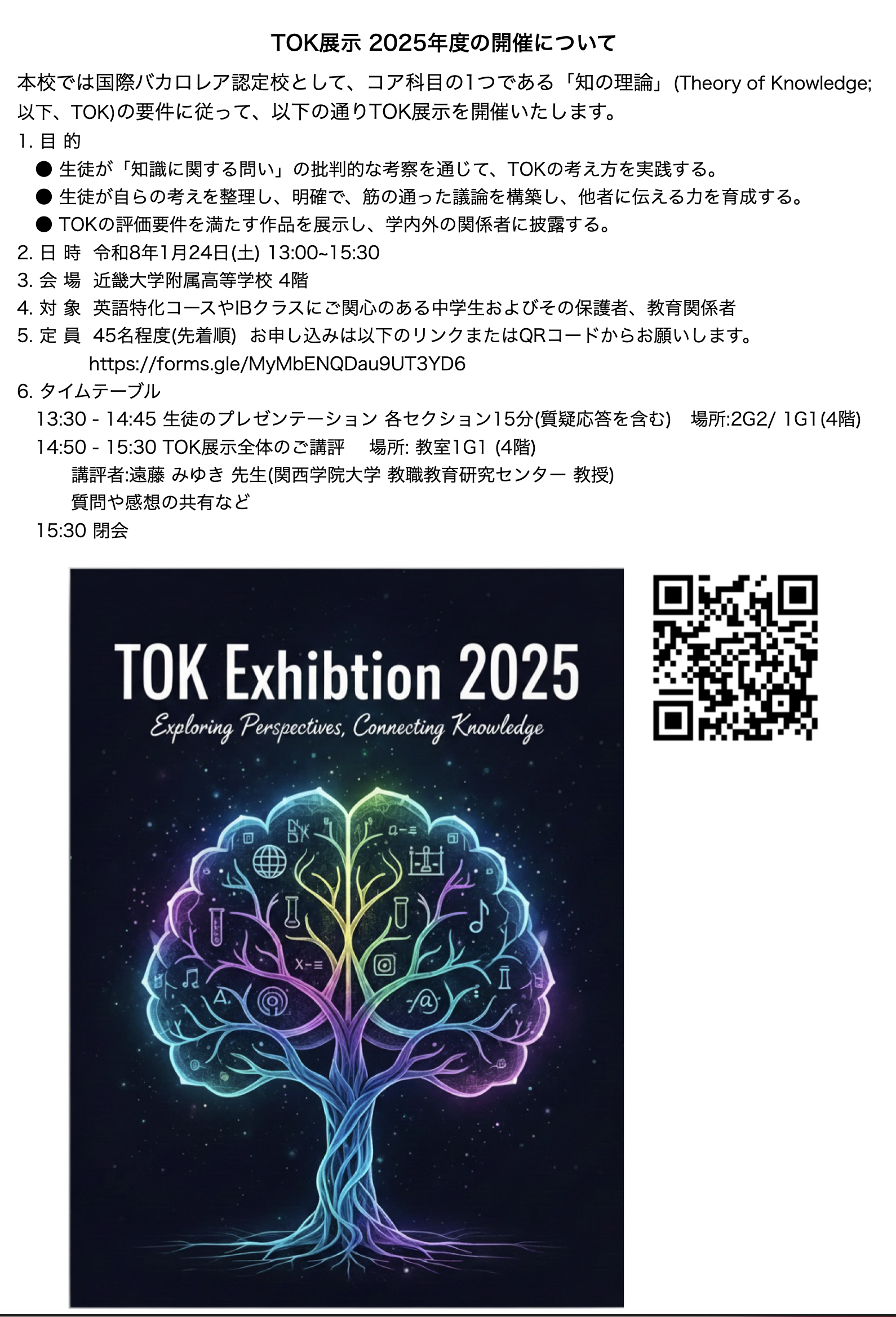 本校では、国際バカロレア(IB)認定校として、IBディプロマ・プログラムのコア科目の一つである「知の理論(Theory of Knowledge:TOK)」の要件に基づき、IBクラス2期生によるTOK展示を、下記のとおり開催いたします。