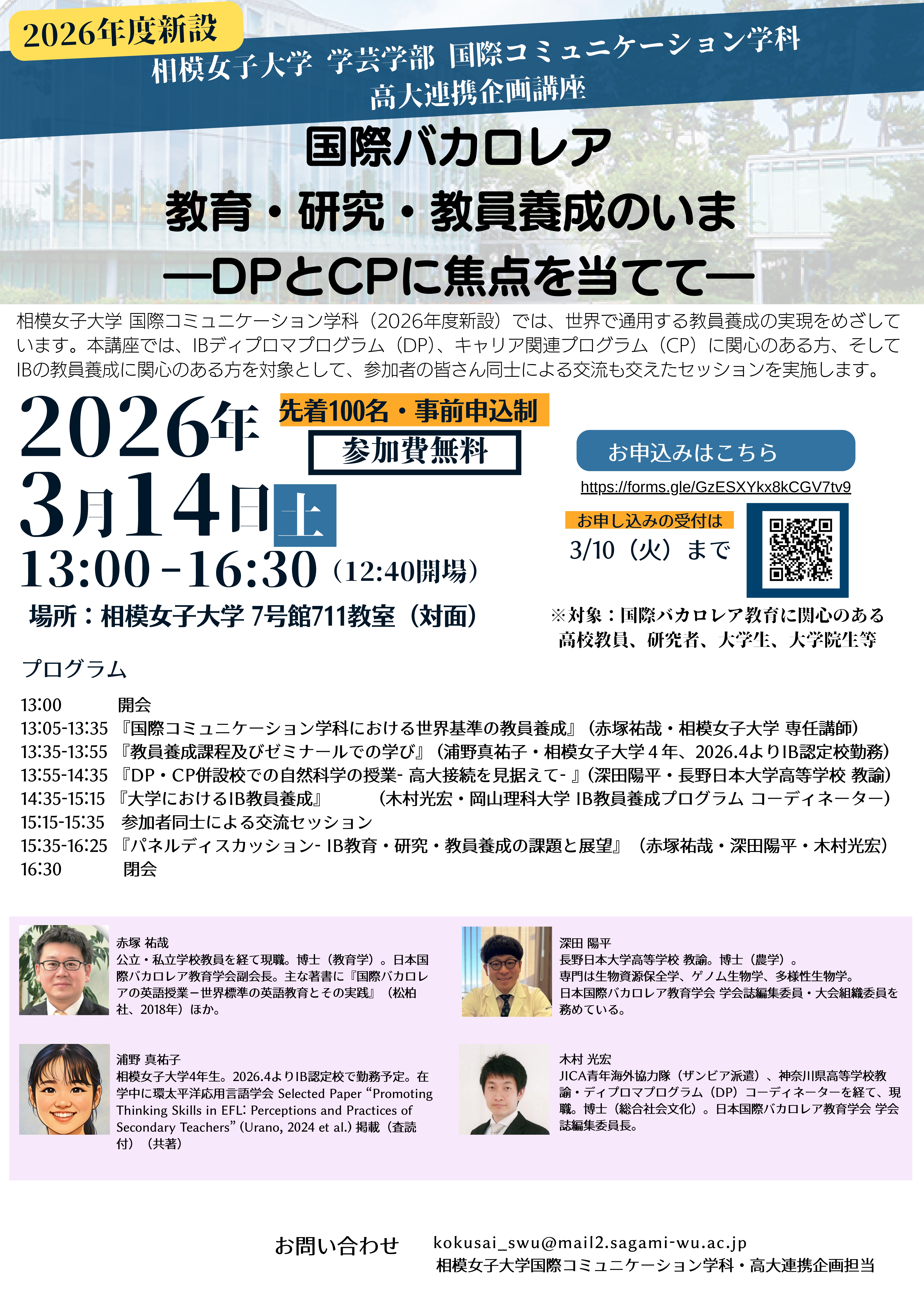 【2026年3月14日(土)】相模女子大学 学芸学部 国際コミュニケーション学科 高大連携企画講座 『国際バカロレア 教育・研究・教員養成のいま―DPとCPに焦点を当ててー』
