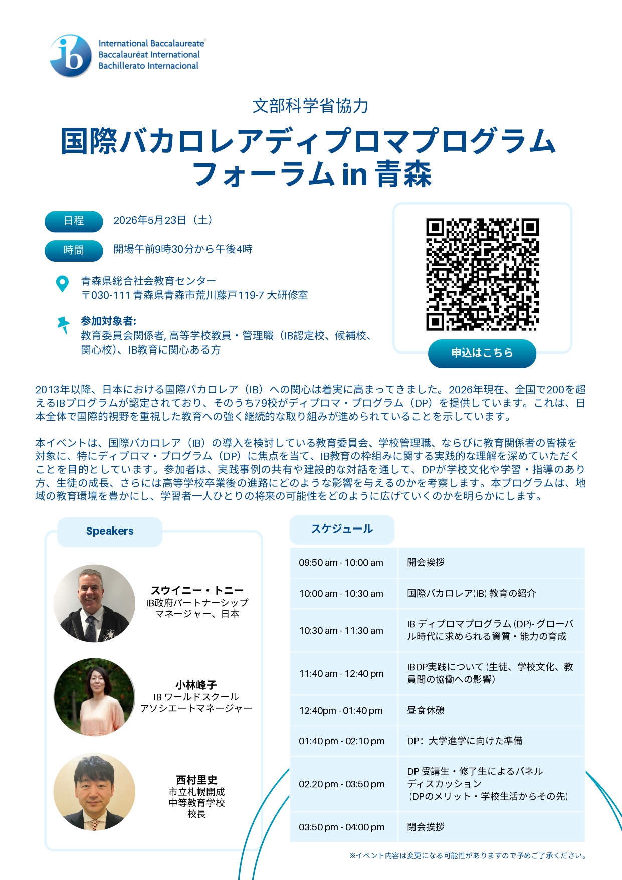 【2026年5月23日(土)】国際バカロレアディプロマプログラム フォーラムin青森(国際バカロレア機構主催)