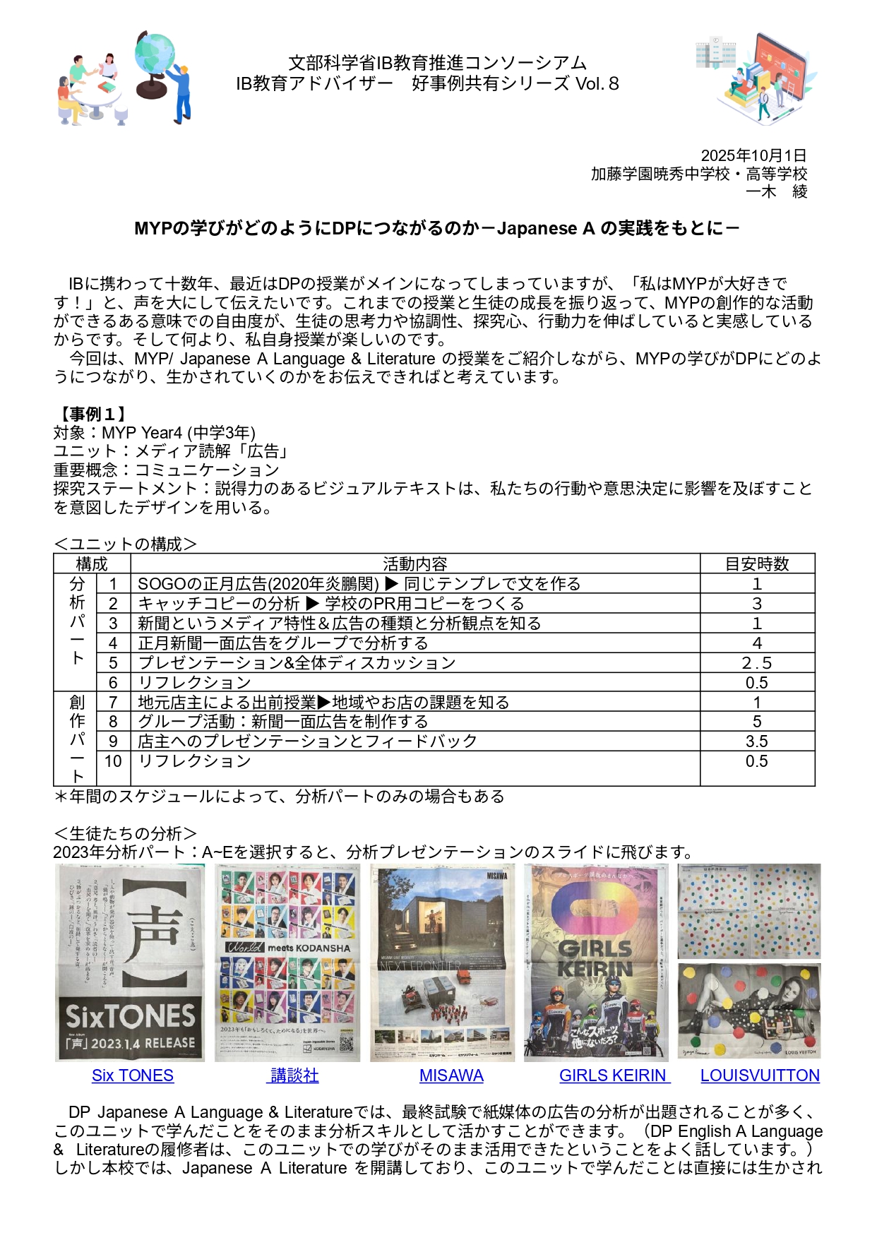 MYPの学びがどのようにIBに携わってDPにつながるのか ~Japanese Aの実践をもとに~